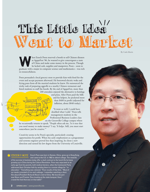 When Enoch Poon reserved a booth to sell Chinese dinners at a music festival near campus, he wanted to give concertgoers a taste of China and make some money in the process. What the college senior lacked in cash, supplies, and manpower, he made up for in vision and creativity.