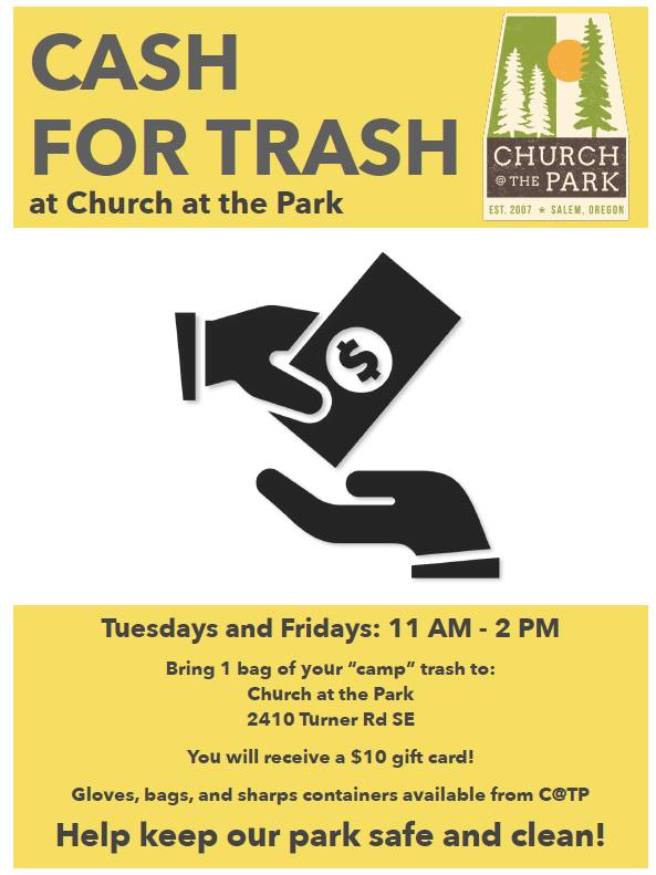 Church at the Park doesn’t follow the common “hierarchical” model of server and receiver. Instead, it includes the population it serves as co-laborers. The group’s “Cash for Trash” program exemplifies this approach. Last year, residents of homeless encampments in the Cascades Gateway Park redeemed full bags of trash for $10 gift cards.